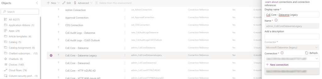 In this example I’ll use the Centre of Excellence Starter Kit environment that I inherited from a previous colleague, and for demo purposes I’m going to modify the Dataverse Legacy Connector as it is currently in the correct state to demo.